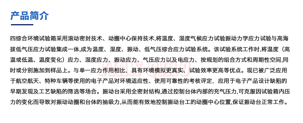產(chǎn)品型號:JQTHAV-非標(biāo)定制型 品牌:劍 喬 用途:四綜合環(huán)境試驗(yàn)箱采用滾動密封技術(shù)、動圈中心保持技術(shù),將溫度、濕度氣候應(yīng)力試驗(yàn)振動力學(xué)應(yīng)力試驗(yàn)與高海拔低氣壓應(yīng)力試驗(yàn)集成一體,成為溫度、濕度、振動、低氣壓綜合應(yīng)力試驗(yàn)系咨詢熱線:13829135130