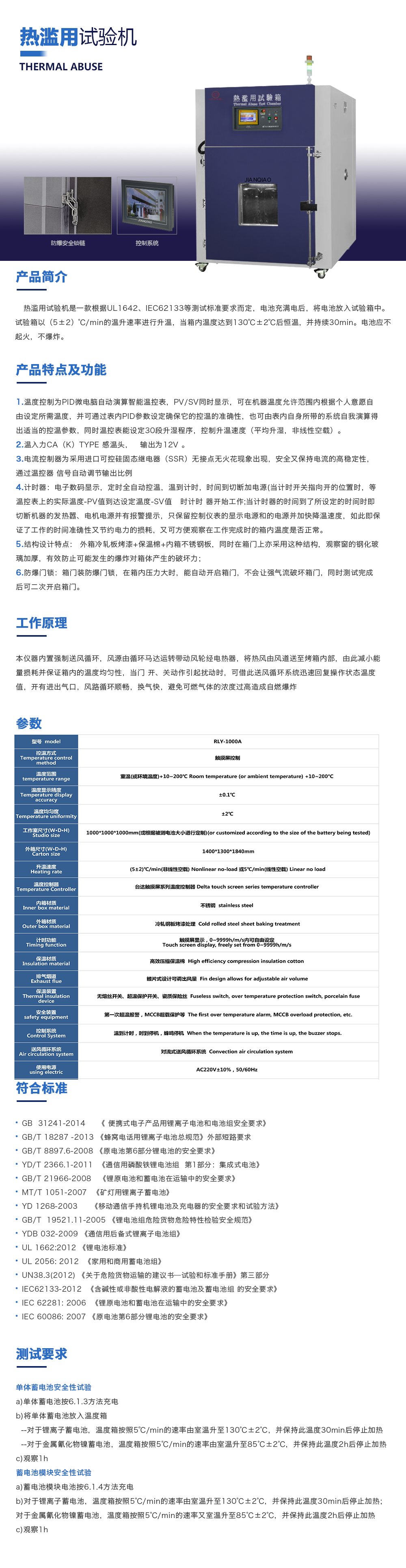 用途:熱濫用試驗(yàn)箱是一款根據(jù)UL1642、IEC62133等測試標(biāo)準(zhǔn)要求而定,電池充滿電后,將電池放入試驗(yàn)箱中。試驗(yàn)箱以(5±2)℃/min的溫升速率進(jìn)行升溫,當(dāng)箱內(nèi)溫度達(dá)到130℃±2℃后恒溫,并持續(xù)