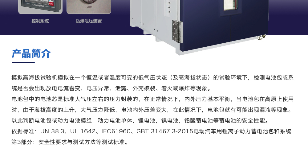 產(chǎn)品型號:JQ-8203-5㎡ (定制款) 品牌:劍 喬 用途:模擬高海拔試驗機模擬在一個恒溫或者溫度可變的低氣壓狀態(tài)(及高海拔狀態(tài))的試驗環(huán)境下,檢測電池包或系統(tǒng)是否會出現(xiàn)放電電流睿變、電壓異常、泄露、外殼破裂、著火或爆炸等咨詢熱線:13829135130