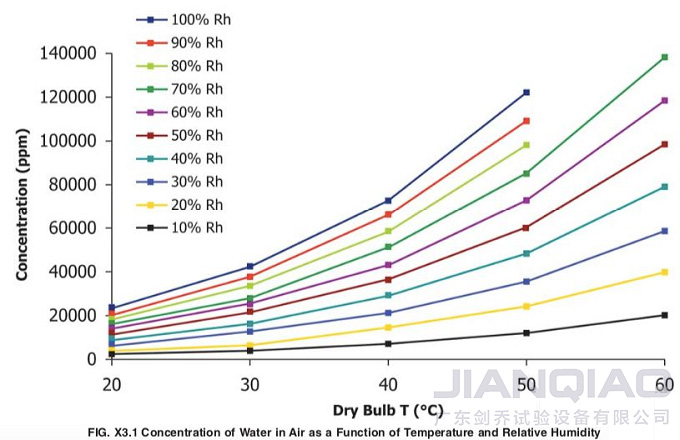 附錄X3中,表3.1是恒定水蒸氣含量下,相對濕度與溫度的關系。而圖3.1是水蒸氣含量、溫度、相對濕度三者之間的關系。在考慮了相對濕度對產(chǎn)品材料的損傷性后,大家可以針對一定溫度建立適宜的相對濕度范圍,進而調(diào)整試驗條件。