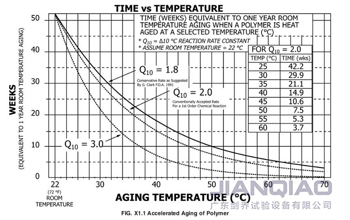 大家仔細分析上述兩個公式可以發(fā)現(xiàn),決定加速老化時間的關鍵因素是加速老化溫度,根據(jù)ASTM F1980-16附錄X1.1,能夠明確無菌屏障系統(tǒng)在選定溫度下的熱老化相當于1年的室溫老化的時間。例如,若確定Q10為2,加速老化溫度選用50℃,則加速老化時間為7.5周。特別要注意的是,大多數(shù)醫(yī)用聚合物建議的溫度上限是60℃。
