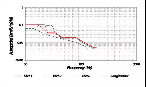 SAE J2380標(biāo)準(zhǔn)振動目標(biāo)譜基于實際道路測量數(shù)據(jù),旨在模擬行駛10萬英里對電池組和模塊的影響。該標(biāo)準(zhǔn)要求一系列隨機振動目標(biāo)譜應(yīng)用于三個垂直軸,試驗時長從9分鐘到38小時不等。
